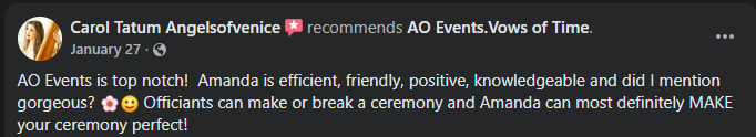 Screenshot of a Facebook review praising officiant Amanda Olivares for her warmth, positivity, patience, and understanding during a wedding on October 31, 2025.